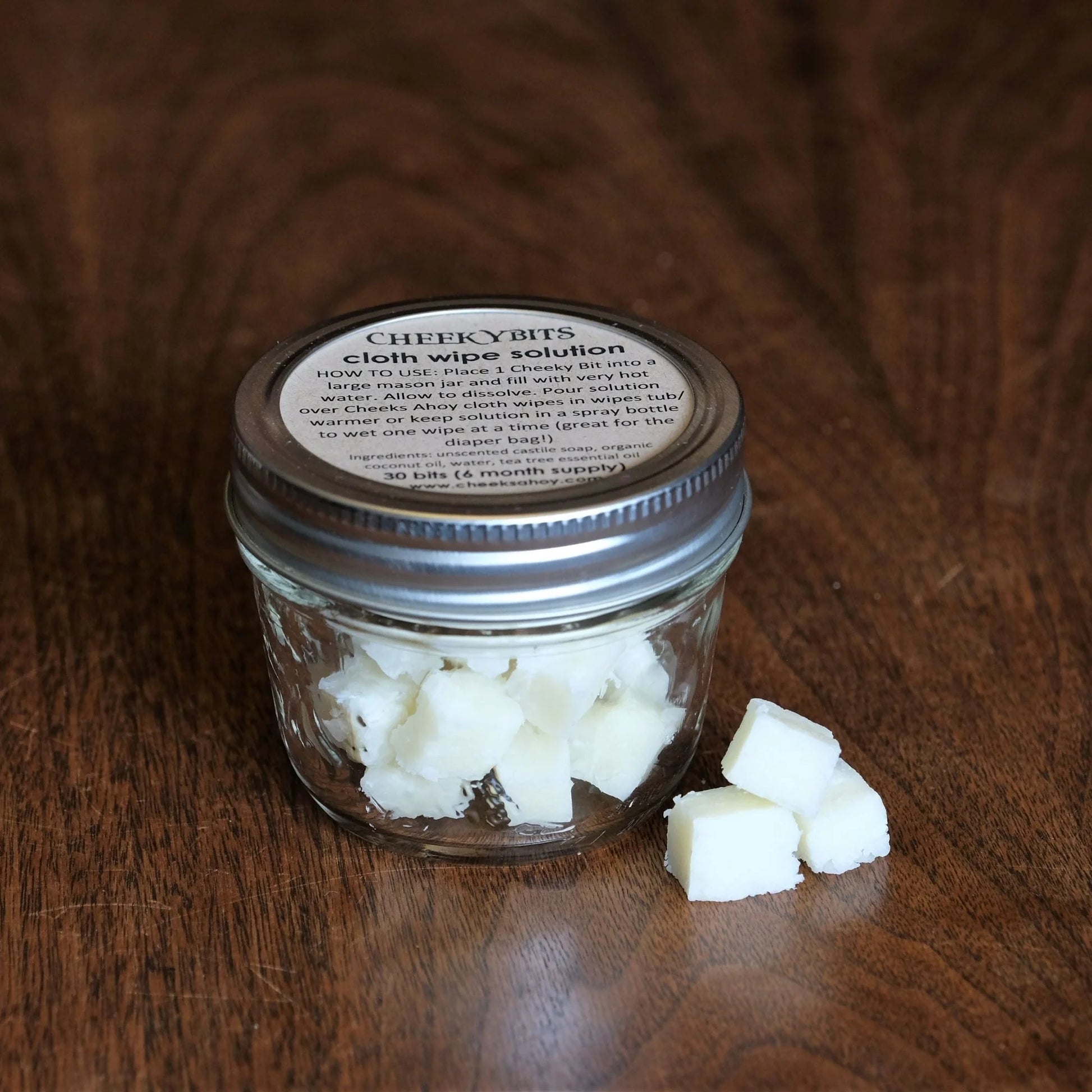 Cheeky Bits cloth wipe solution cubes are the super-convenient way to completely replace disposable wipes, just add water! This little mason jar contains 30 bits, approximately 6 months' worth of solution cubes.