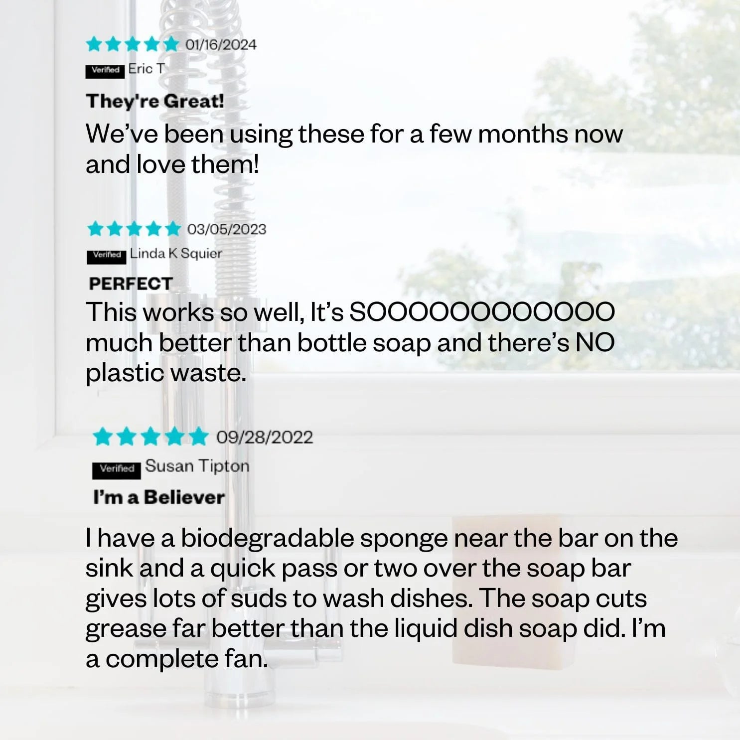 The water has been removed for an ultra concentrated bar that cuts through grease and outlast typical dish soap bottles, making them much more earth-friendly and cost-effective. These concentrated coconut lemon dish soap bars are made from 100% plant-based ingredients without any plastics or synthetics, allowing them to biodegrade much faster.