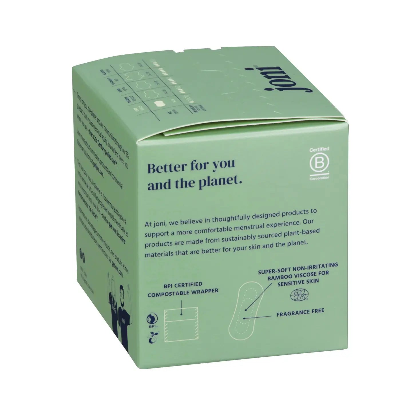 All joni pads are 92% biodegradable in 12 months. All joni pads are OEKO-TEX®, ECOCERT certified, chlorine free, antibacterial and hypoallergenic.