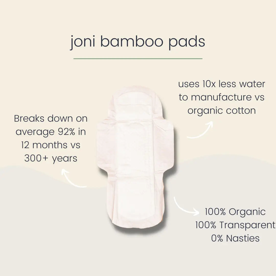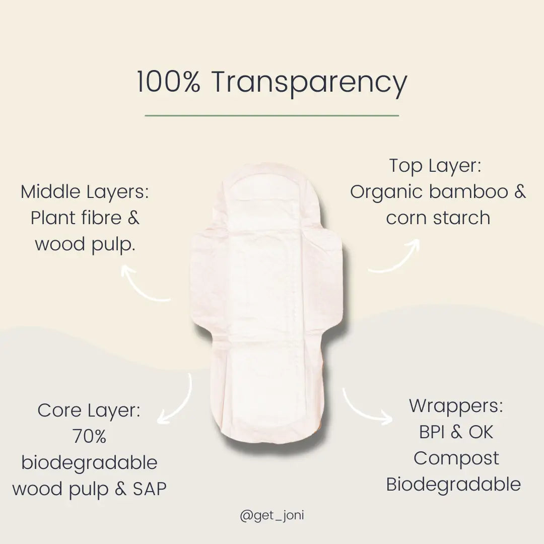 All joni pads are 92% biodegradable in 12 months. All joni pads are OEKO-TEX®, ECOCERT certified, chlorine free, antibacterial and hypoallergenic.