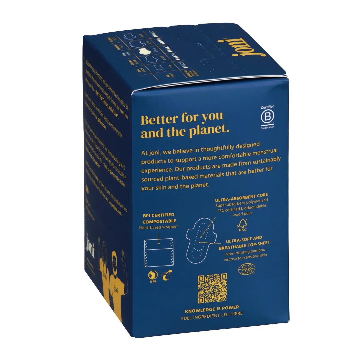 10 pads in box Extra soft top sheet for sensitive skin & extra comfort Ultra-thin and winged Chlorine and dioxin bleach free Pad length - 29.5 cm / 9.65 inches Medium to heavy flow All joni pads are 92% biodegradable in 12 months. All joni pads are OEKO-TEX®, ECOCERT certified, chlorine free, antibacterial and hypoallergenic. All joni pads are made from natural corn, Ecocert organic bamboo, wood pulp, polymer, plant-based PLA & PBAT, food-grade adhesive.
