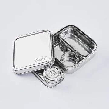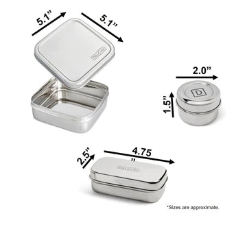 Includes: 3 items - 1 Sandwich Box (5.1 (W) x 5.1 (L) x1.85 (H) ”), 1 Little Snacker (4.75 (W) x 2.5 (L) x 1.5 (H) ”), & 1 Condiment Container (2 (D) x 1.5 (H) ”). All items can be used together or separately!