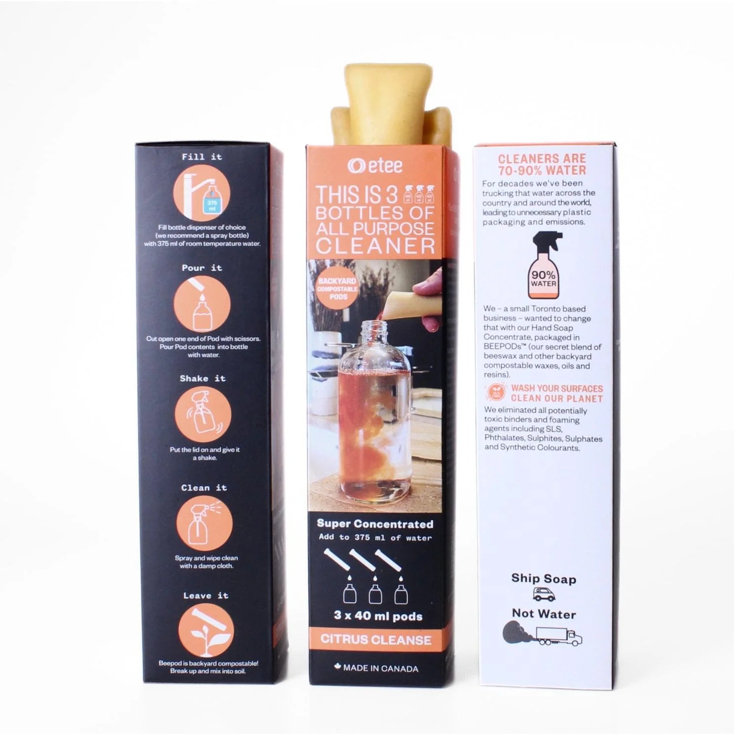 Loved for its ability to gently remove dirt and grime just as well as the leading brands, our probiotic all-purpose cleaner uses lab-tested chemistry but WITHOUT plastic and the wasted emissions of shipping water. Packaged in (internally developed and manufactured in Toronto) backyard compostable pods and formulated with probiotics. The probiotics in our cleaner help to reduce the presence of potentially harmful microbes, eliminate the source of bad smells, reduce the use of harsh chemicals, and continue working after application for an effective clean that will last. Formulated without any harsh chemicals.