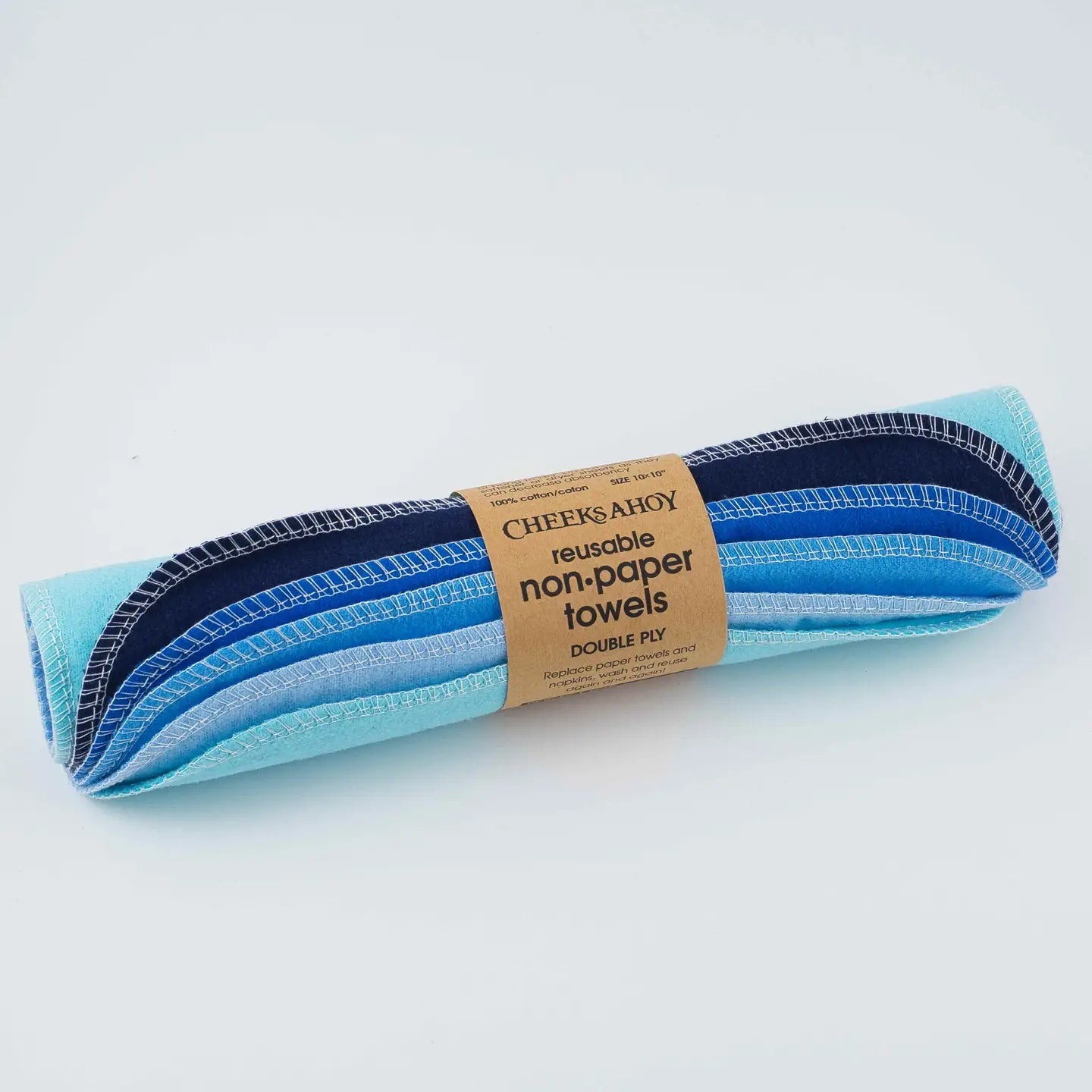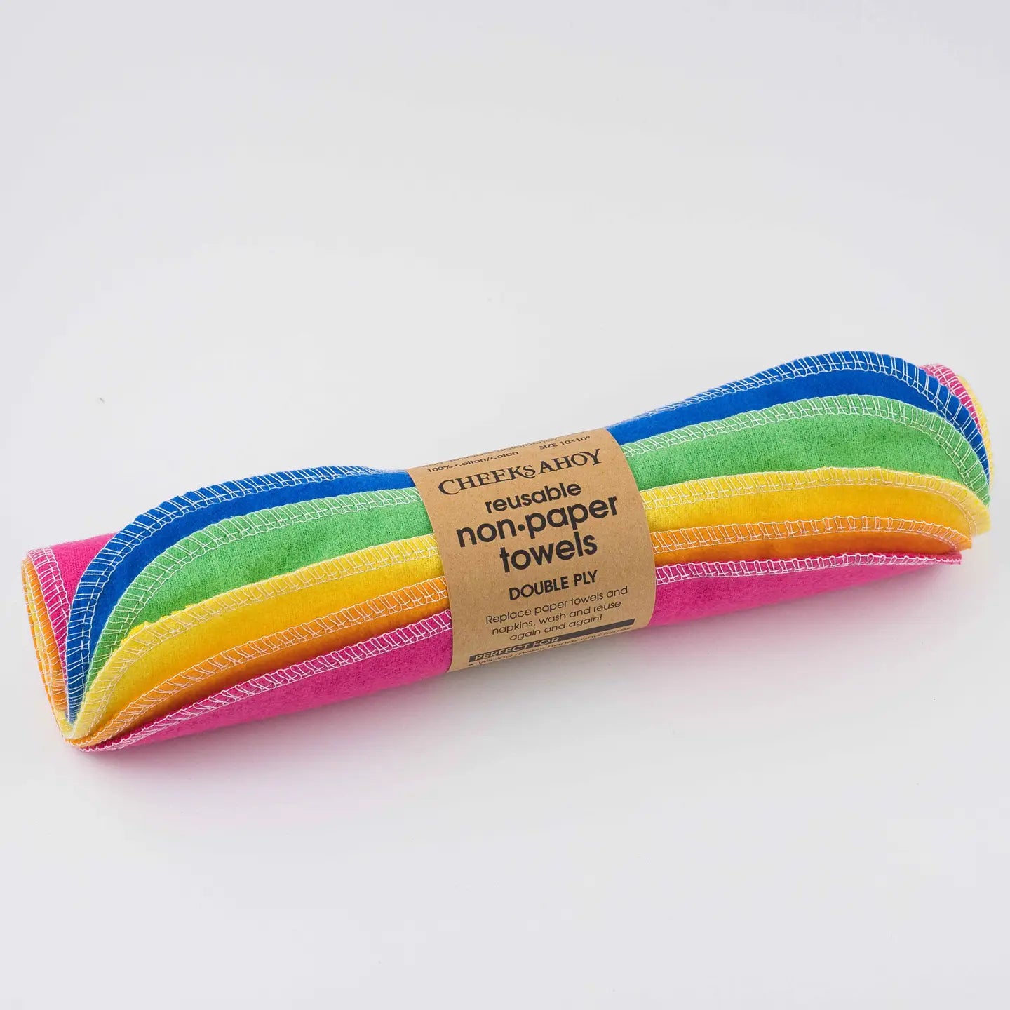 Perfect for wiping messy hands and faces after meals, spill clean-up, washing and drying dishes, meal time napkins, lint-free cleaning and dusting. Each Non-Paper Towel is 2 ply and 10"x10". Edges are surged for durability and to prevent fraying. Set of 5.