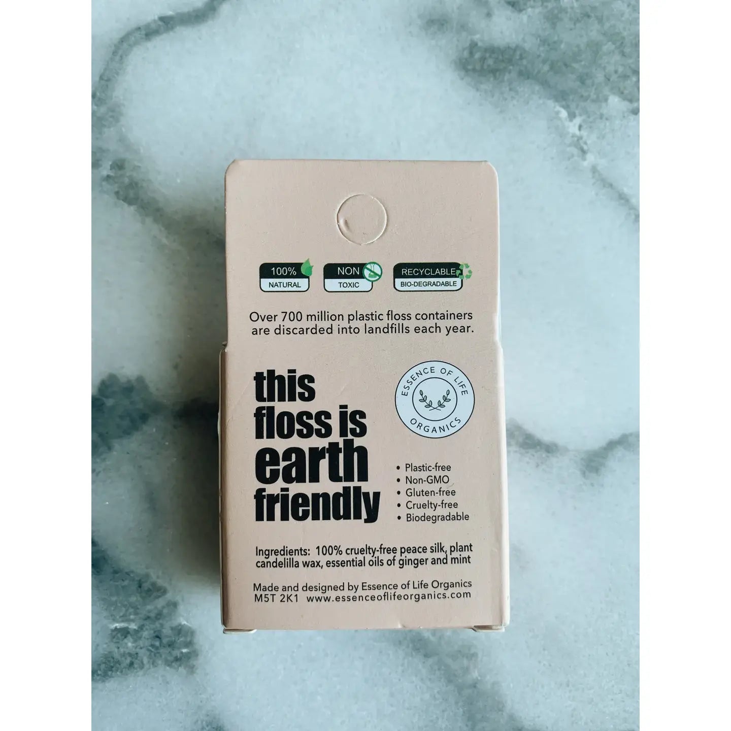 biodegradable floss is made of cruelty-free mulberry peace silk and coated with vegan Candelilla wax and essential oils.