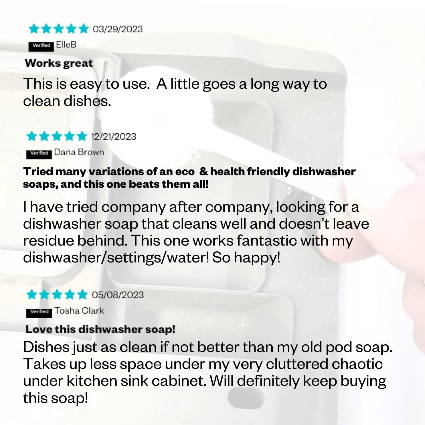 Effective cleaning power with just ONE TEASPOON! With such a small amount needed you'll get sparkling clean dishes without the hassle of plastic waste, harsh chemicals and bulky storage. With an EWG rating of under 3, we've formulated a gentle but tough super concentrated dishwasher detergent so you get the most for your money.