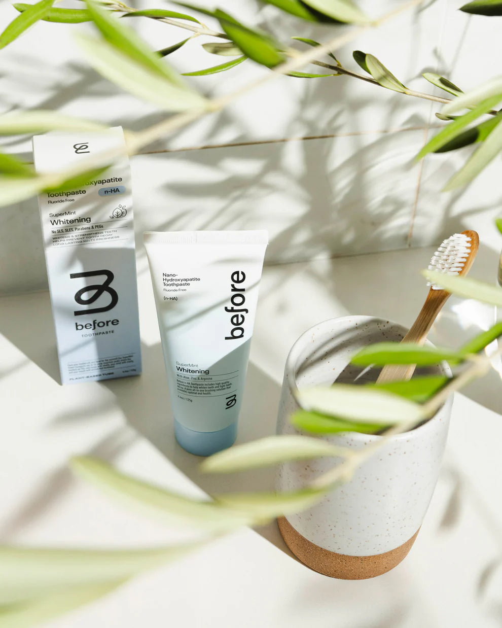 Discover a fluoride-free toothpaste that works in harmony with your smile. Infused with nanoXIM® Hydroxyapatite, Before n-HA Whitening Toothpaste brightens teeth while naturally supporting enamel health. It helps smooth away microcracks and daily wear, revealing a whiter, stronger smile with every brush.