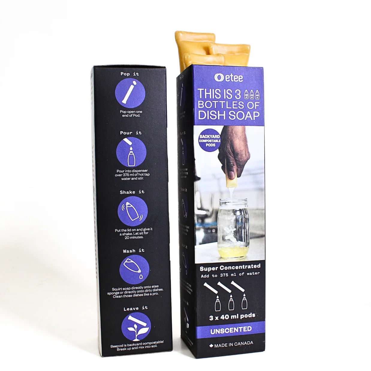 Loved for its ability to effectively cut grease and clean, our Unscented Super Concentrated Liquid Dish Soap suds up just as well as the leading brands, but WITHOUT plastic and the wasted emissions of shipping water. Packaged in our very own (internally developed and manufactured here in Toronto) backyard compostable pods and formulated without artificial foaming agents like SLS, our dish soap is best in class for washing your dishes and cleaning our planet.