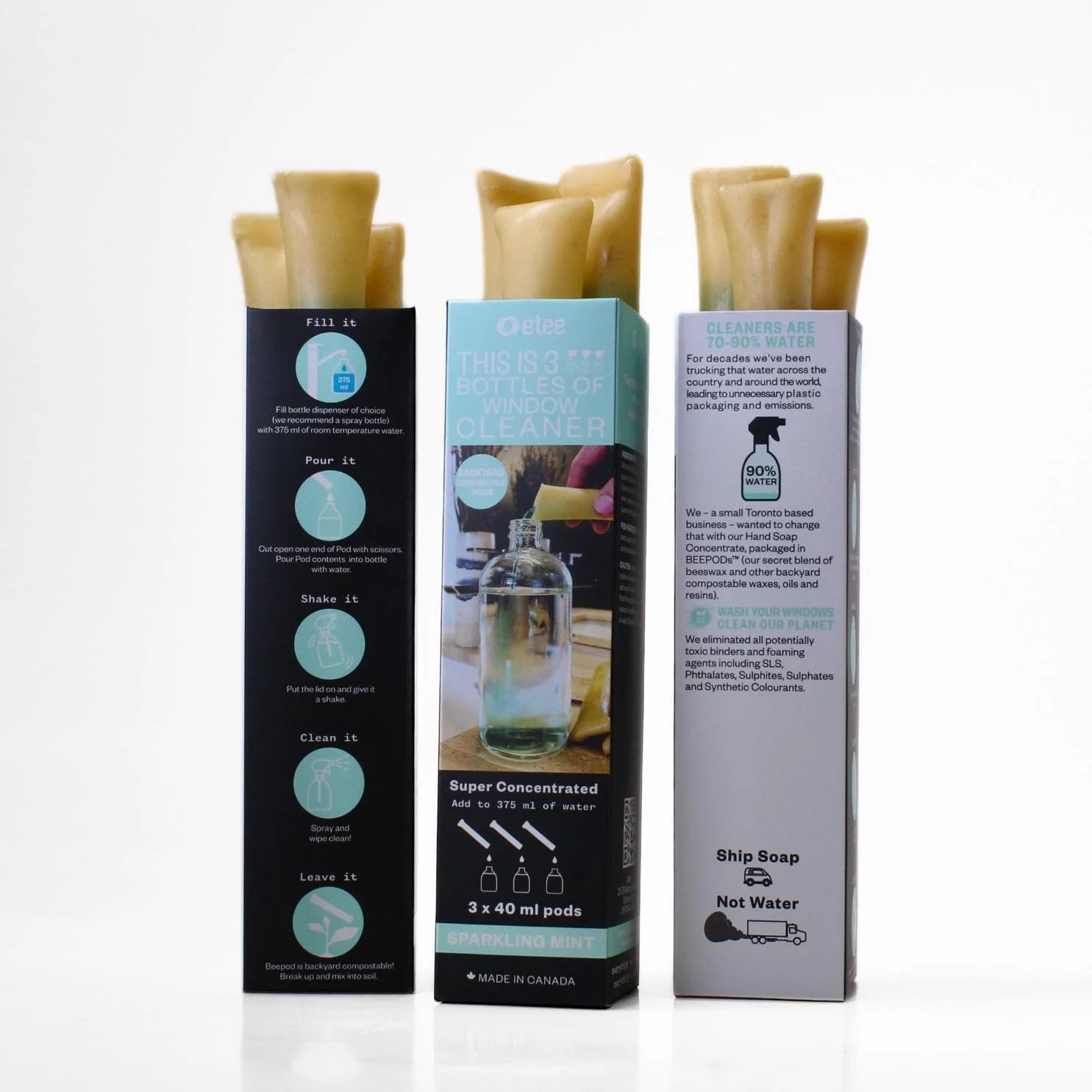 Gently wipe away dust, grime, and foot/paw prints just as well as the leading brands, our window cleaner concentrate uses lab-tested chemistry but WITHOUT plastic and the wasted emissions of shipping water. Packaged in our very own (internally developed and manufactured here in Toronto) backyard compostable pods and formulated without harsh chemicals. Spiralling mint scent.